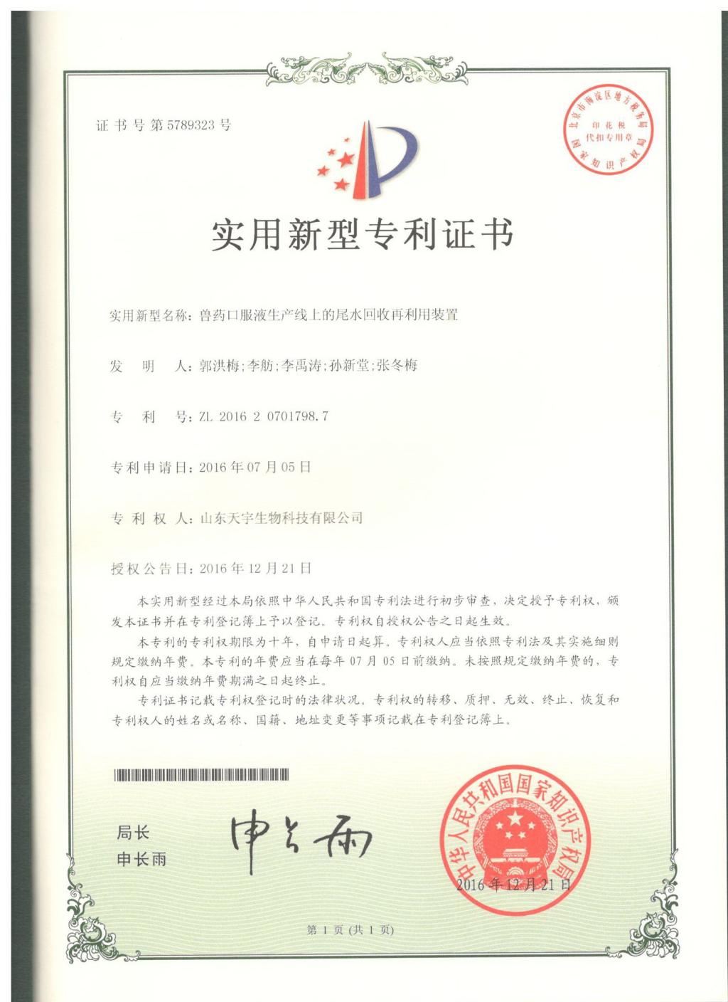 本实用新型属于兽药生产设备技术领域,尤其是涉及一种兽药口服液生产线上的尾水回收再利用装置。包括RO纯水机,所述的RO纯水机与EDI水机相连接,所述的EDI水机通过水管分别与多效蒸馏器和蒸汽发生装置相连接,所述的蒸汽发生装置通过蒸汽管与多效蒸馏器相连接,所述的多效蒸馏器上连接有尾水收集箱,…